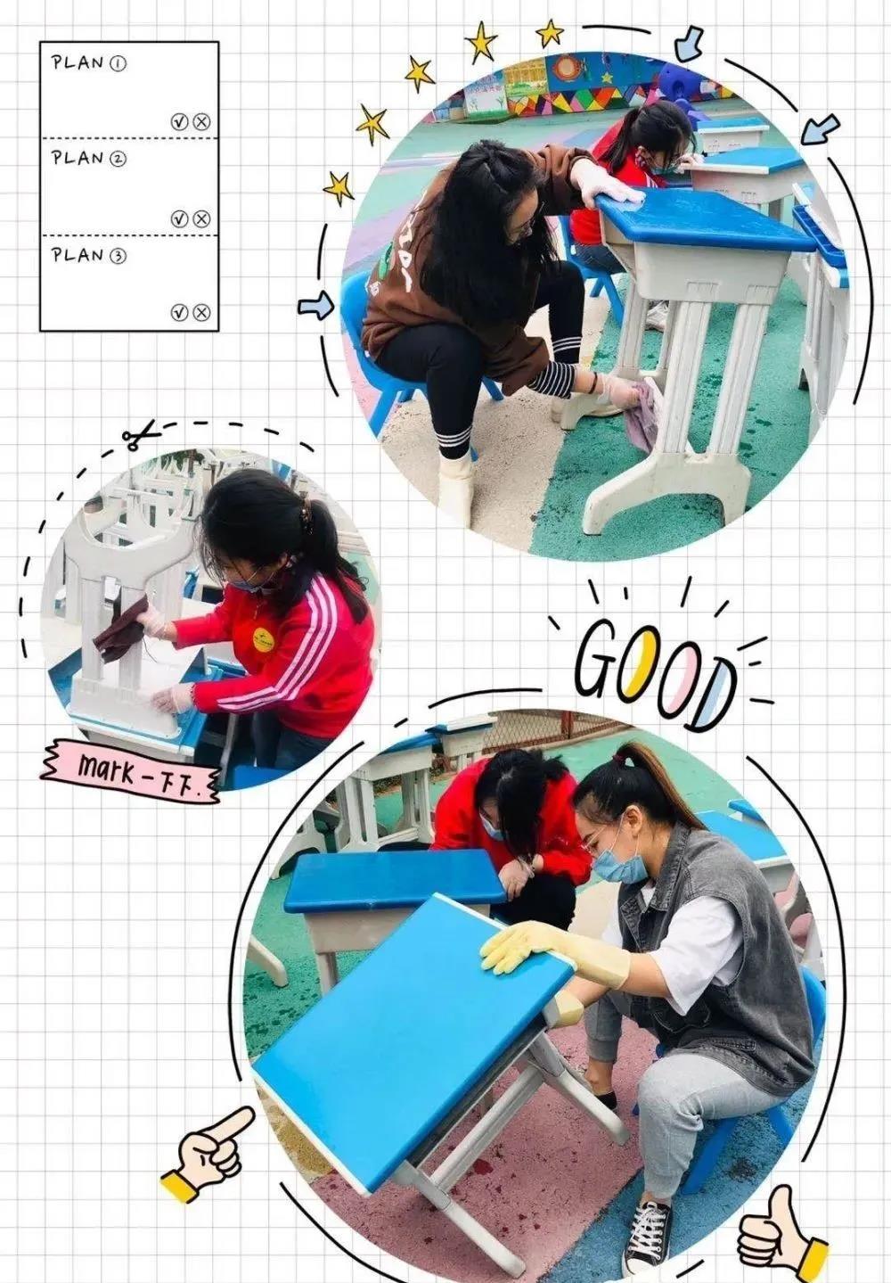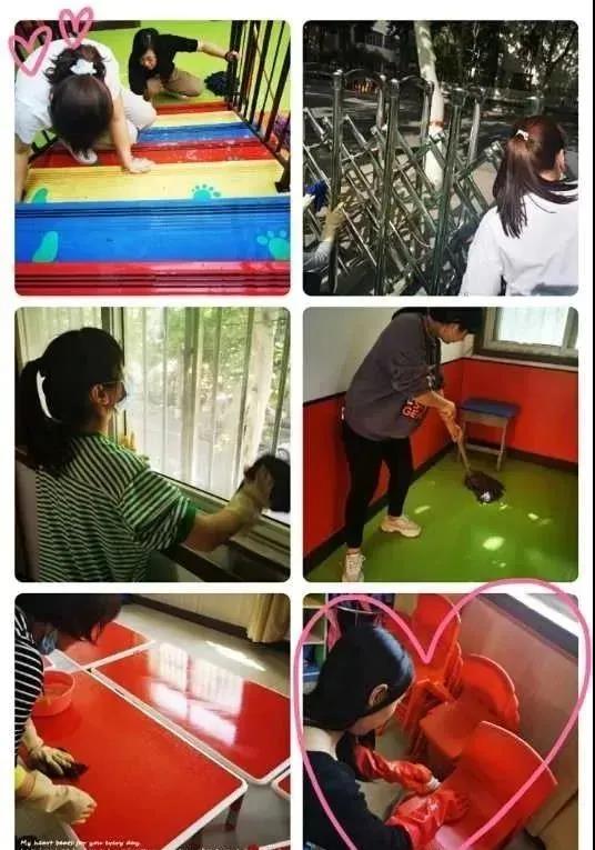 對校區(qū)各個角落進行逐一打掃,孩子們的娛樂實施、教室桌子、樓梯間各個死角進行全部消毒